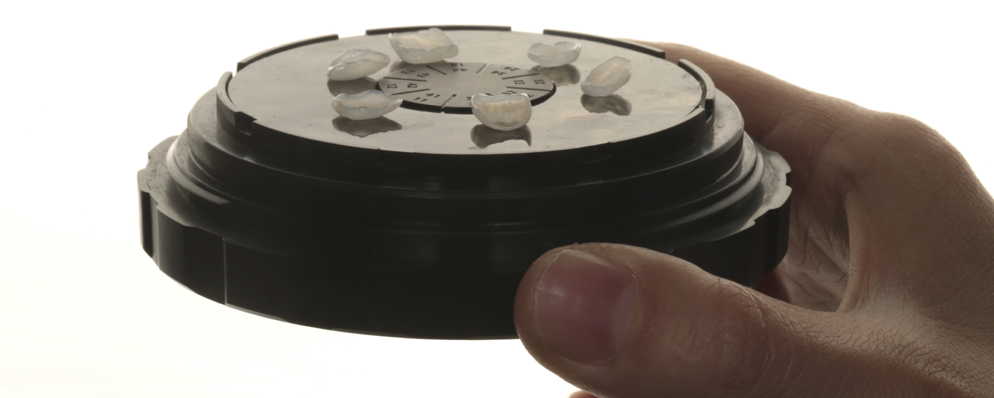 Las carillas una vez acondicionadas se colocaron en el Venner Me, de Smile Line (5), un dispositivo que también sirve para hacer todo el proceso de acondicionamiento de la carilla.
