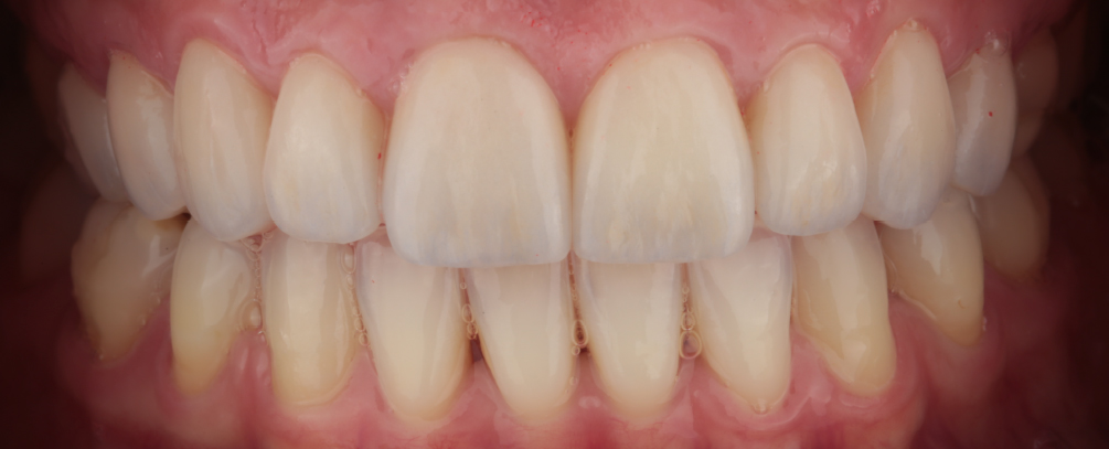 Paciente en máxima intercuspidación después de la fijación adhesiva de las nueve restauraciones cerámicas superiores donde se observa como el técnico pudo emular las características ópticas de los dientes antagonistas para lograr mimetizarse con las restauraciones.